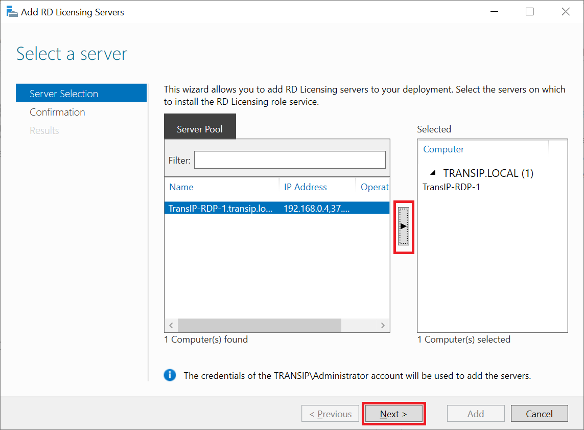 Selecteer een server waarop de RD Licensing role service wordt geïnstalleerd (gebruikt voor licentiecontroles). Standaard zal hier alleen de server zichtbaar zijn waarop je deze handleiding doorloopt.